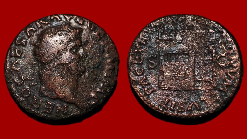Frapée entre 54 et 68 après J.-C. à Rome, cette monnaie en bronze représente l’empereur Néron, une figure marquante – et controversée – de l’histoire impériale. Elle mesure 27 mm de diamètre, pèse 9,34 g et est classée en état TB. L’avers montre le buste de Néron, tandis que le revers présente le temple de Janus fermé, symbole de paix. À noter : le flan est légèrement voilé, ce qui affecte un peu sa valeur.
