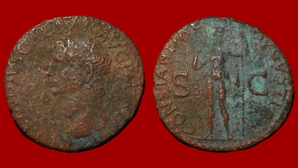 Cette seconde monnaie nous emmène au cœur de l’Empire romain, sous le règne de l’empereur Claude, entre 41 et 54 après Jésus-Christ. Elle a été frappée à Rome, se compose de cuivre et a un diamètre de 25 millimètres pour un poids de 9,29 grammes. À l’avers, le portrait de Claude est représenté, fidèle au style de l’époque. Sur le revers, on peut observer la déesse Minerve, debout, armée d’une javeline dans la main droite et tenant un bouclier de la gauche. La pièce est classée en état TB+, ce qui signifie qu’elle reste bien lisible et agréable à observer malgré quelques traces d’usure.