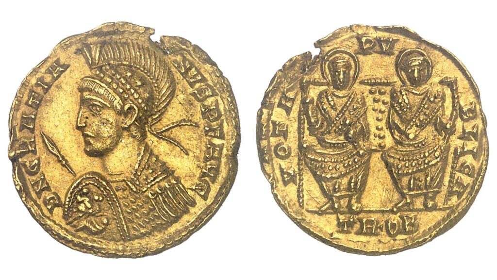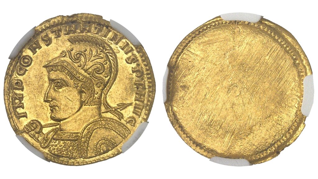 Bien qu’il ne s’agisse pas à proprement parler d’une monnaie, ce médaillon en or frappé en 318 ap. J.-C. est une pièce militaire d’exception, remise aux troupes auxiliaires sous le règne de Constantin Ier.