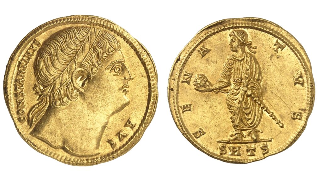 Pièce frappée à Thessalonique en 326 ap. J.-C., à l’occasion des vicennalia (20 ans de règne), ce médaillon impérial en or est le seul exemplaire connu à ce jour.