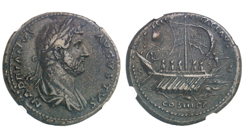 Ce sesterce en bronze, frappé entre 132 et 134 ap. J.-C., représente le retour de l’empereur Hadrien après un de ses nombreux voyages à travers l’empire.