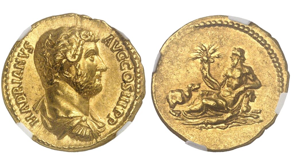 Représentant le Nil sous forme humaine, cette pièce est un hommage au voyage d’Hadrien en Afrique. Elle mêle symbolique, exotisme et finesse de frappe.