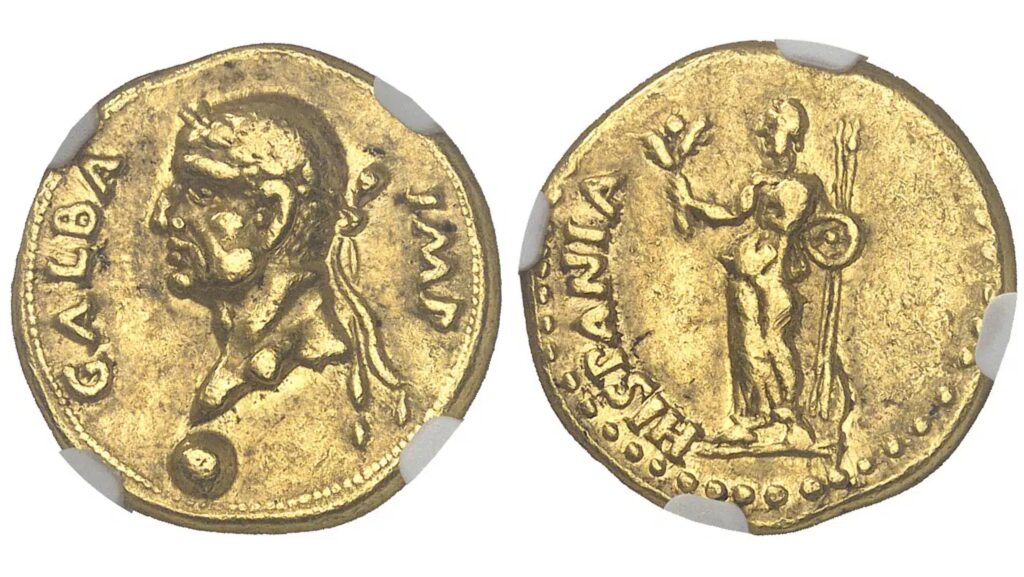 L’empereur Galba ne régna qu’un an, entre 68 et 69 ap. J.-C. Ce règne éclair rend ses monnaies particulièrement rares, surtout en or. Cet aureus est l’un des plus exceptionnels connus.