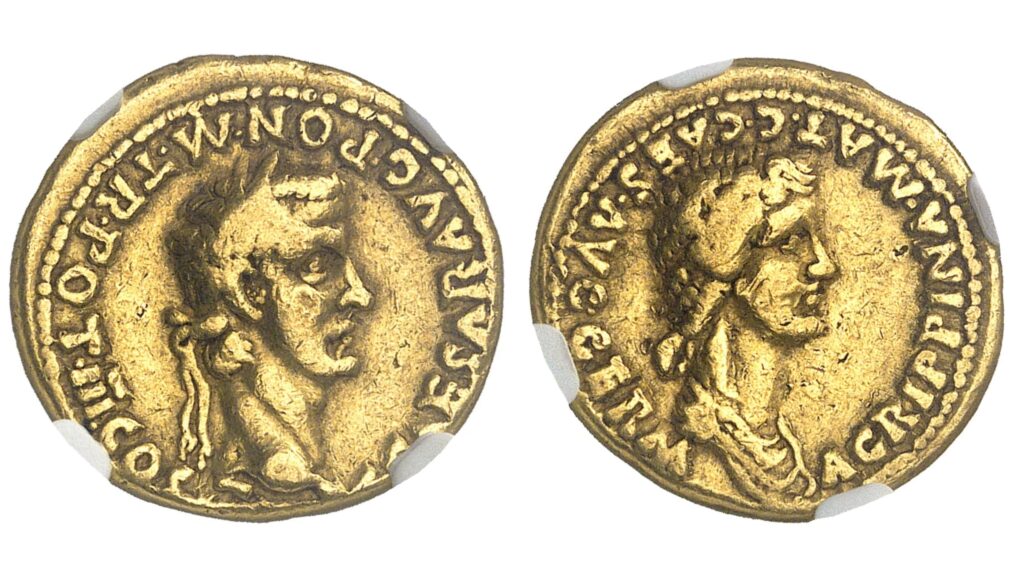 Cette monnaie en or frappée en 40 ap. J.-C., à Rome, représente à l’avers Caligula et au revers sa mère Agrippine l’Ancienne. Deux figures controversées ce qui donc une monnaie emblématique.