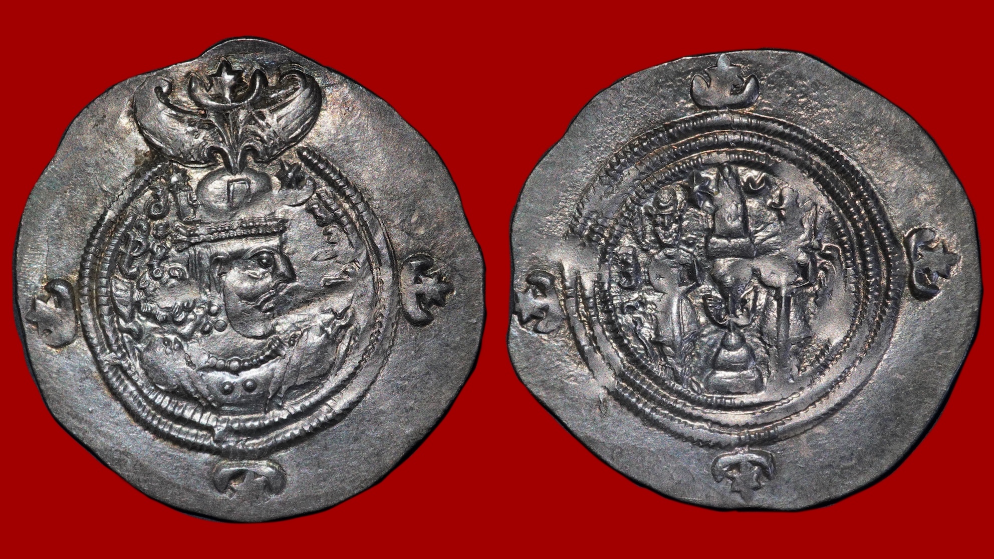 Avers : Buste de Chosroès II, entouré d’un double grènetis avec trois croissants étoilés