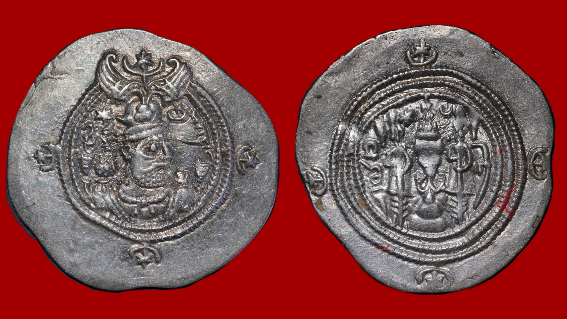Avers : Buste de Chosroès II, entouré d’un double grènetis avec trois croissants étoilés