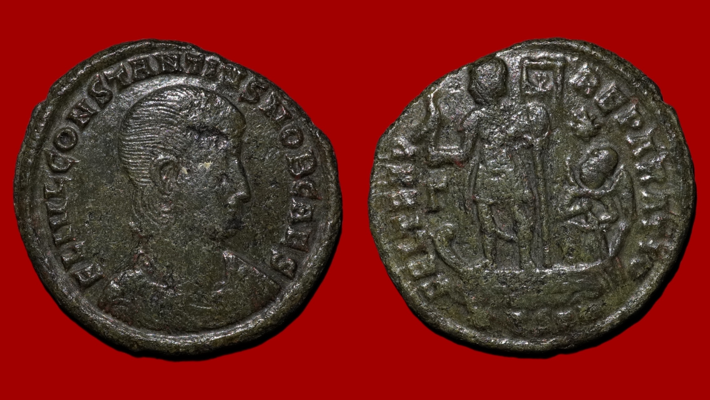Revers : Constance Galle debout, sur une galère, tenant un labarum de la main gauche et un globe surmonté d’une phénix de la droite. Derrière lui, Victoria agenouillée, tenant une rame / FEL TEMP RE PARATIO – *TS(Gamma)