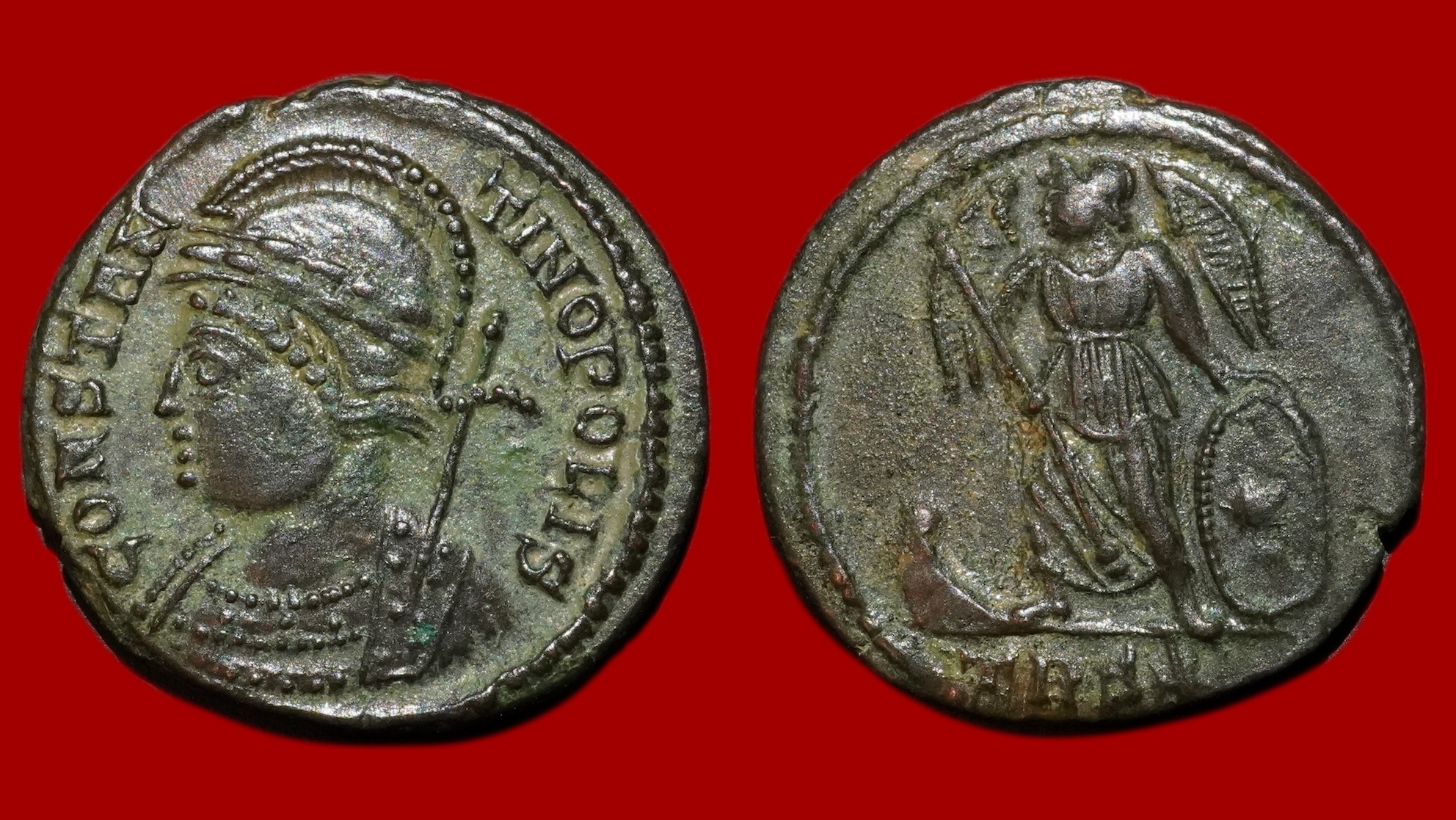 Histoire : En 330, lors de la dédicace de Constantinople (5 mai), un type monétaire spécifique est frappé uniquement dans cet atelier. Il symbolise l’identification du peuple romain à la nouvelle capitale, dotée d’institutions calquées sur celles de Rome, marquant la continuité politique et civique de l’Empire.