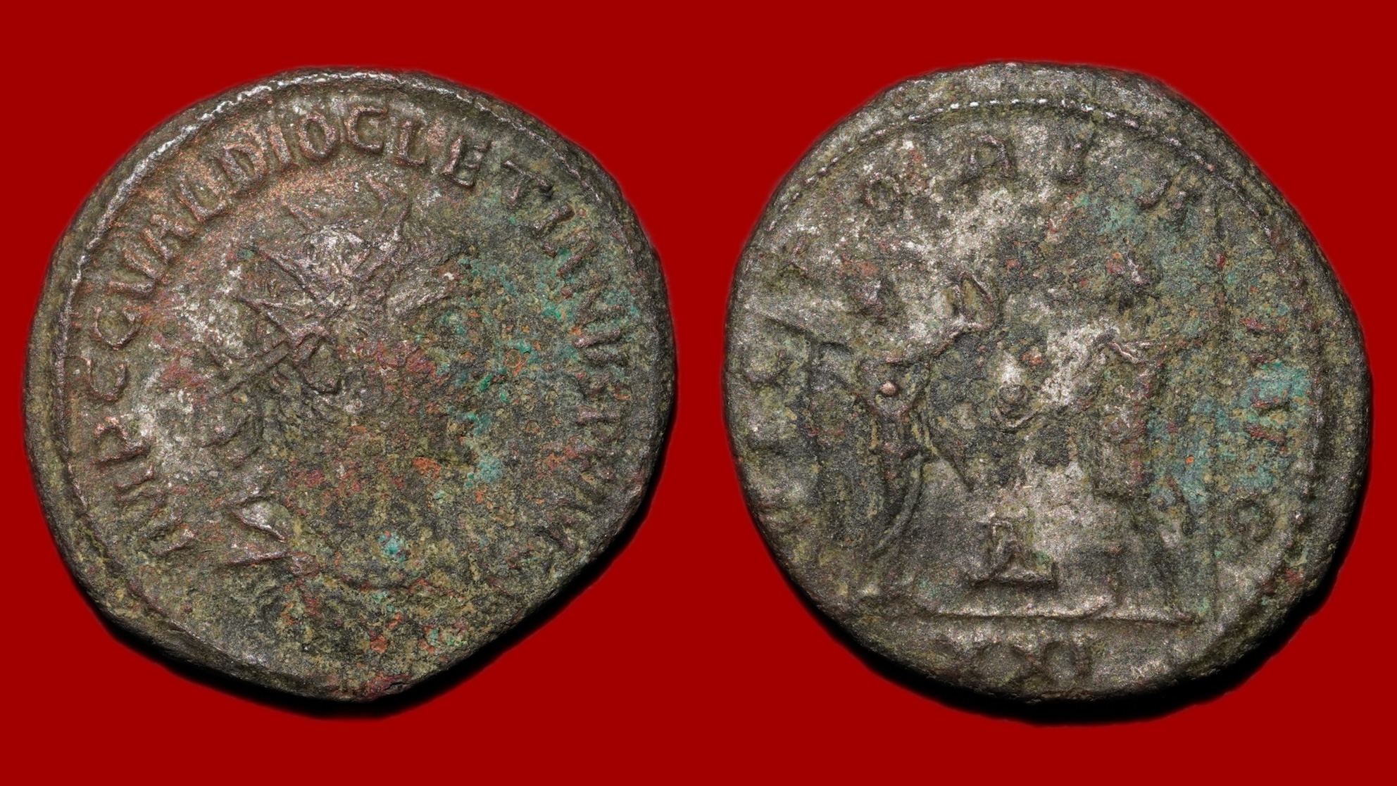 Revers : Victoire debout à gauche, face à Dioclétien, à droite. Victoire tenant une palme, couronnant l’Empereur. Ce dernier, tient un sceptre et un globe / VICTORIA AVGG – XXI