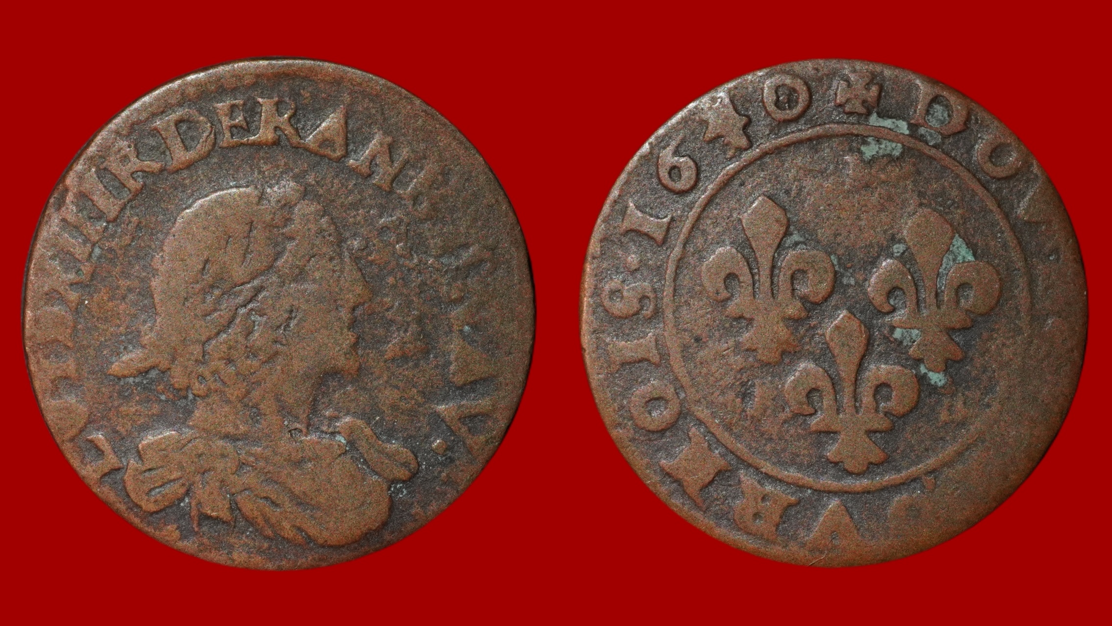 Double Tournois de Louis XIII (1610-1643 ap J-C), 1640, Ateliers de l’axe Loire-Rhône, 20mm, 3.36g, en cuivre.