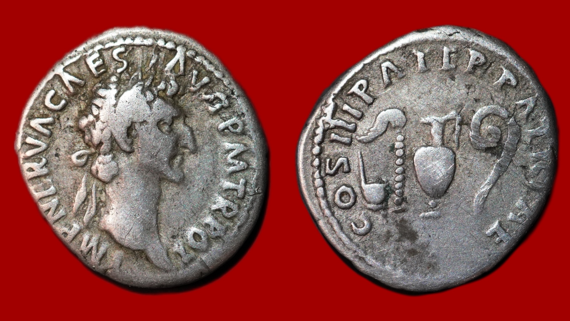 Histoire : Marcus Cocceius Nerva, né le 8 novembre 30 à Narni, mort le 27 janvier 98 à Rome, règne du 18 septembre 96 à 98. Proche de Néron et des Flaviens, il déjoue la conspiration de Pison (65) et obtient le consulat en 71 puis 90. Investi par le Sénat le jour de l’assassinat de Domitien, il promet de restaurer les libertés. Confronté à des tensions financières et à l’hostilité de l’armée, la révolte de la garde prétorienne (octobre 97) le contraint à adopter Trajan. Nerva meurt de causes naturelles en 98 ; Trajan lui succède et le divinise, inaugurant la dynastie des Antonins et une transition du pouvoir pacifique.