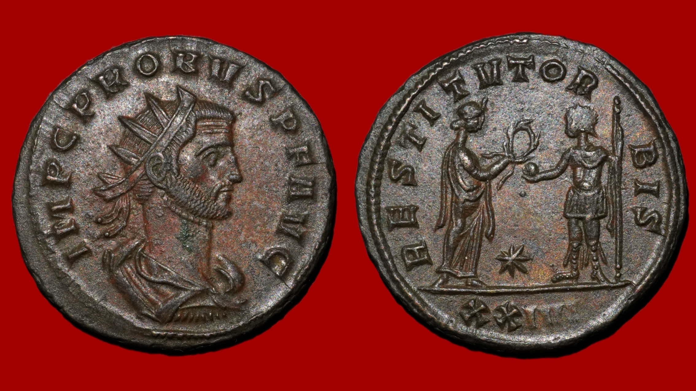 Revers : Victoria à gauche, tendant une couronne à Probus, debout à droite, tenant un globe et un sceptre / RESTITVTOR BIS – XXIVI – *