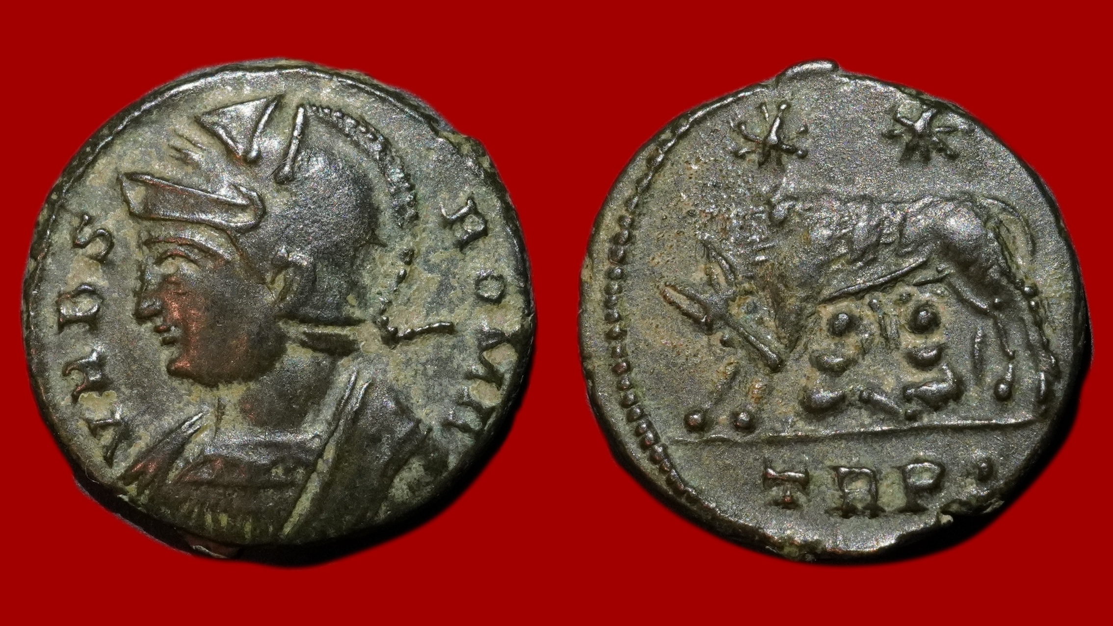 Revers : La Louve allaitant Romulus et Rémus. Au dessus, deux étoiles / TRP.