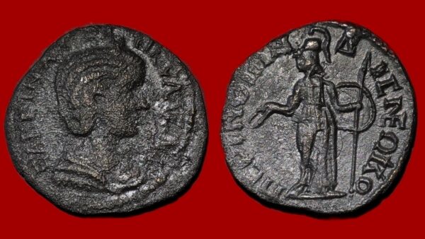 Revers : Athena casquée, debout, tenant une haste et un bouclier de la main gauche et une patère de la droite / ΠΕΡΙΝΘΙΩΝ ΔΙC ΝΕΩΚΟPΩ.
